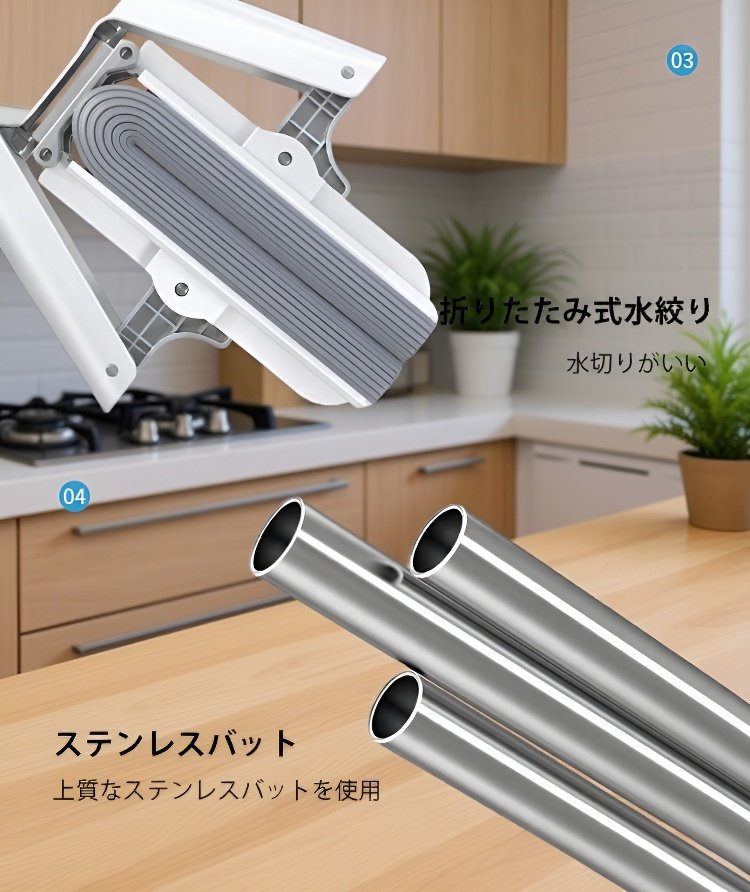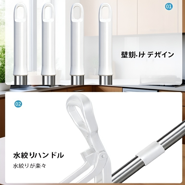 ● 取り外し可能なモップヘッドは、洗濯機で丸洗いできて、いつでも清潔に保つことができます。
